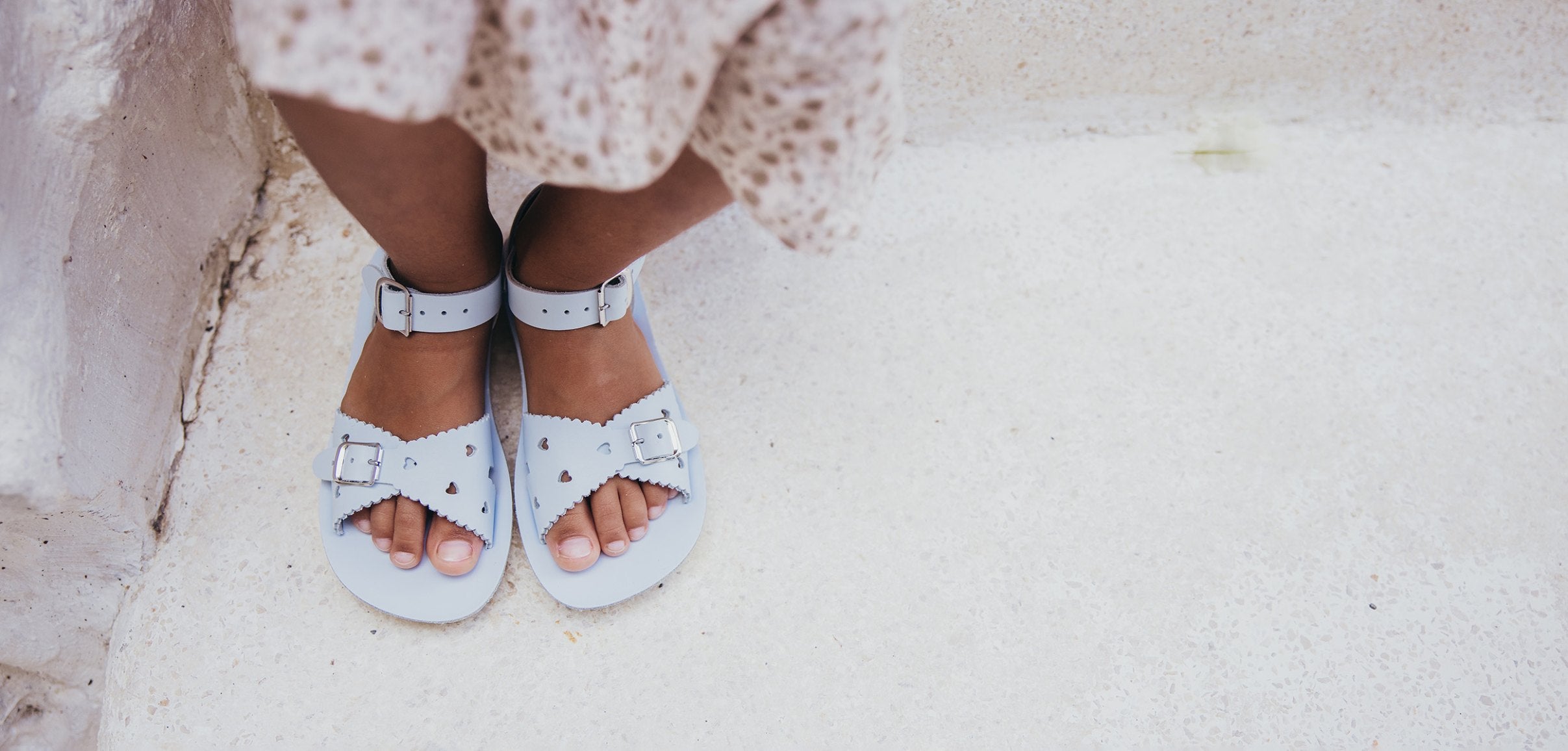 Just like it sounds, The Sweetheart is a super cute kids sandal with heart shape cut-outs and pretty, scalloped edges. Now available in a bright pink leather perfect for precious little feet. Featuring fully adjustable double buckles on the toe and ankle strap, this double buckle kids sandal can be worn in water and, like all Sun-San sandals, comes on a comfortable spongy urethane sole. All children's sizes are made with a velcro fastening under a faux buckle across the ankle strap for day to day ease.